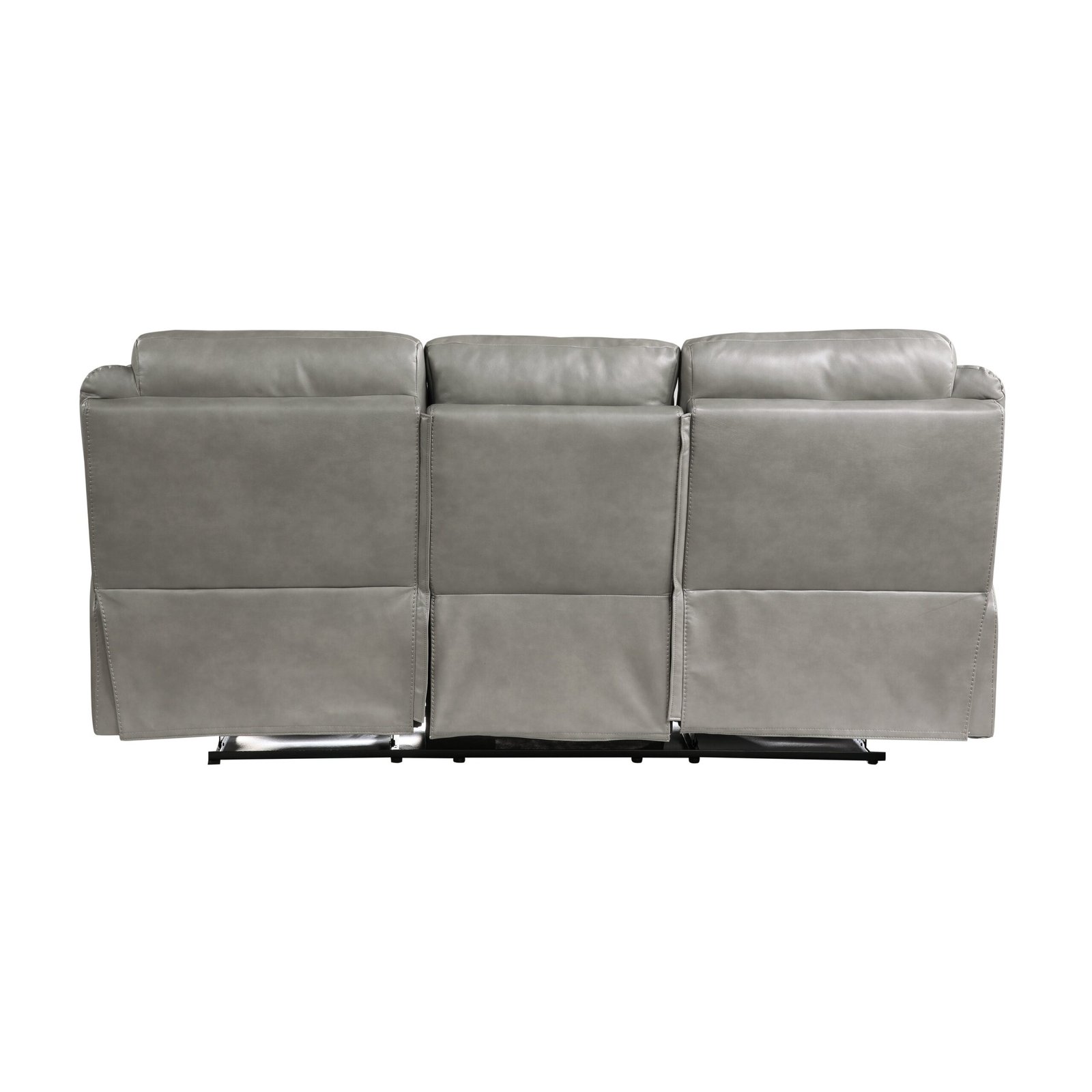 Plush seating, functional accessories and versatile styling blend effortlessly to create the look of the Aram Collection. The gray breathable faux leather upholstery covering will pair perfectly with your transitional decorative preference. The sofa features dual reclining ends, a drop-down center seat back with cup-holders and both electric and USB receptacles, and a hidden storage drawer located below the center seat. The dual manual motion reclining mechanisms of sofa operate with the pull of a side-mounted tab, that once engaged, take you from seated to reclined in an easy motion.