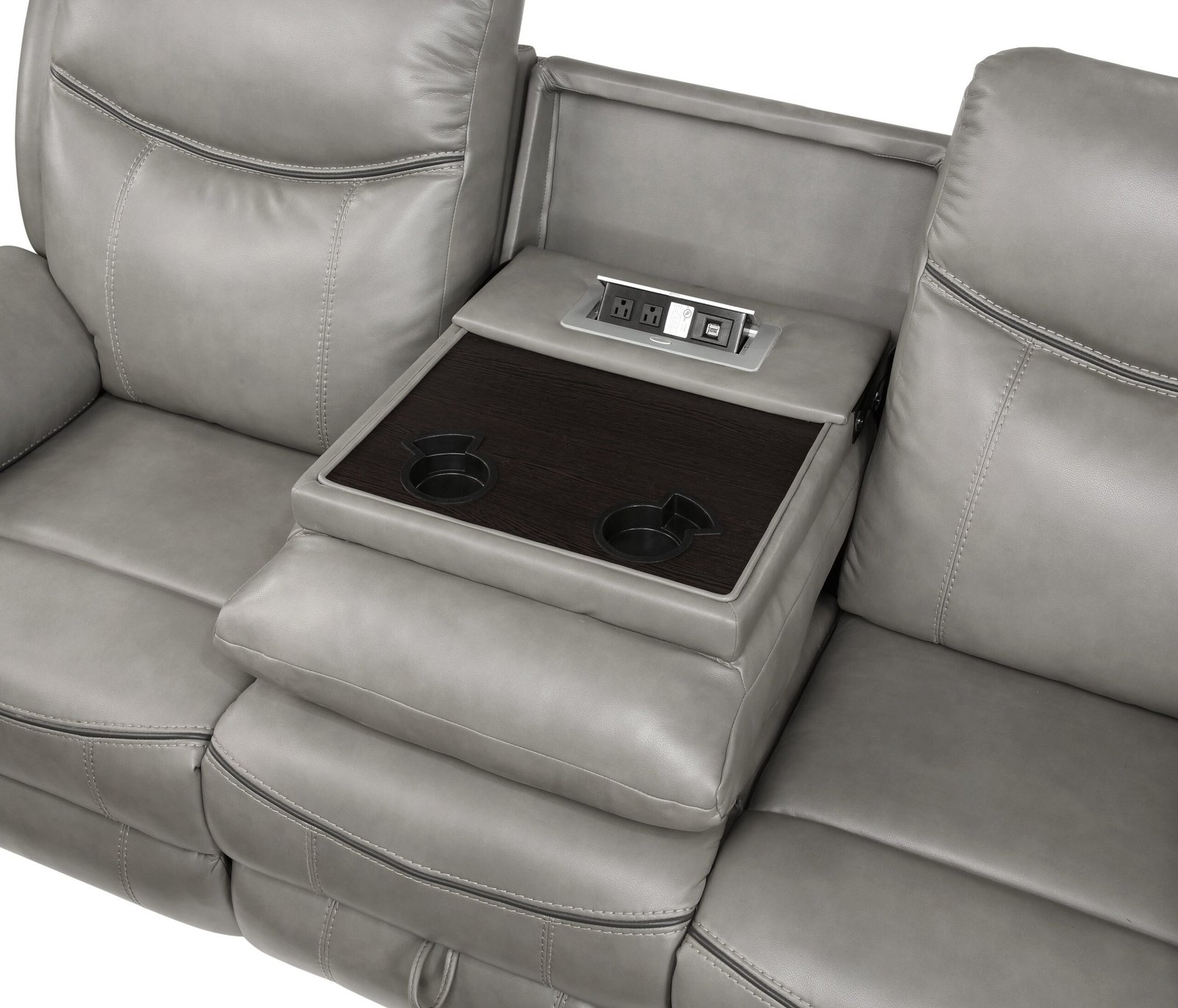 8206GRY-3 – Double Reclining Sofa with Center Drop-Down Cup Holders, Receptacles, Hidden Drawer and USB Ports