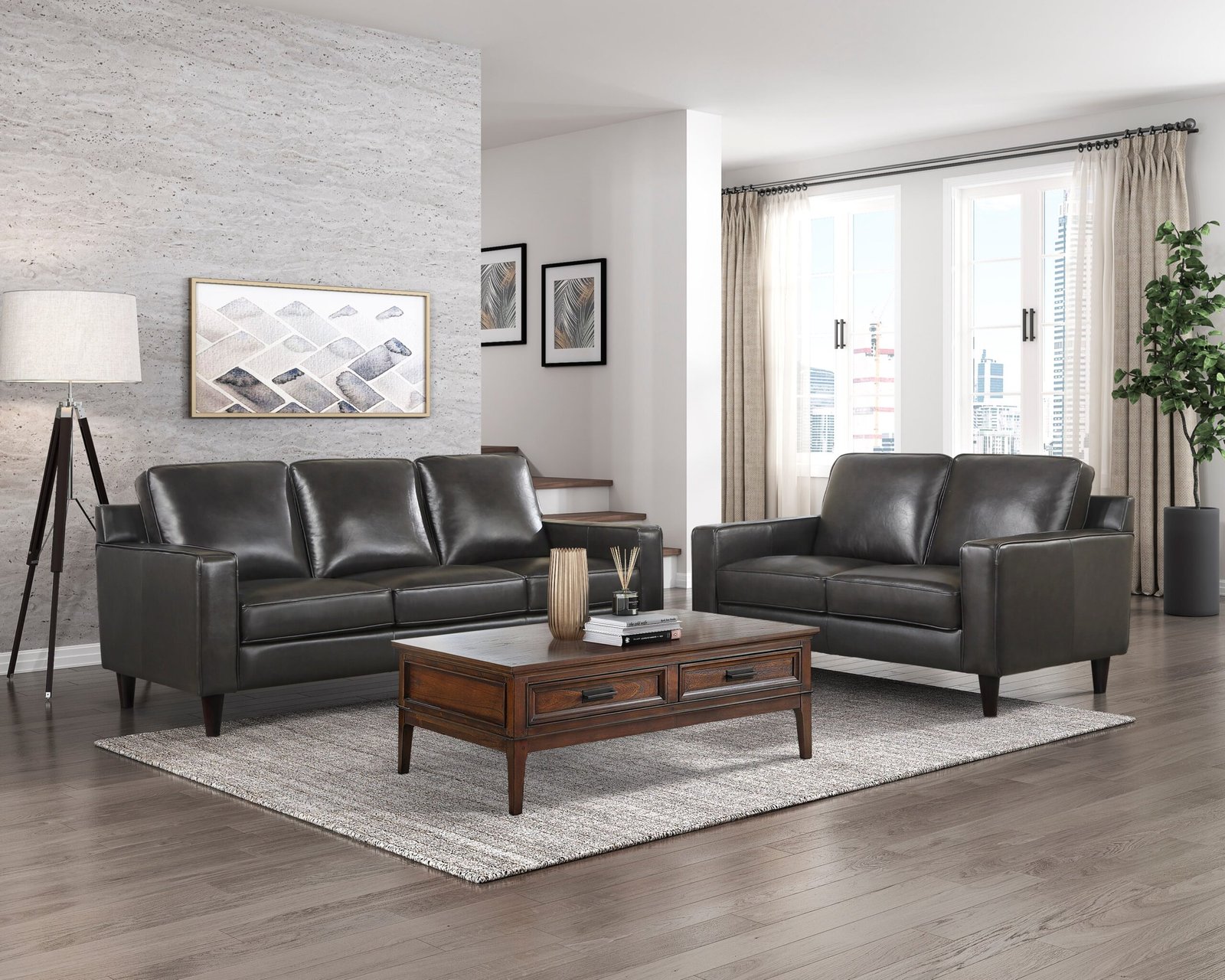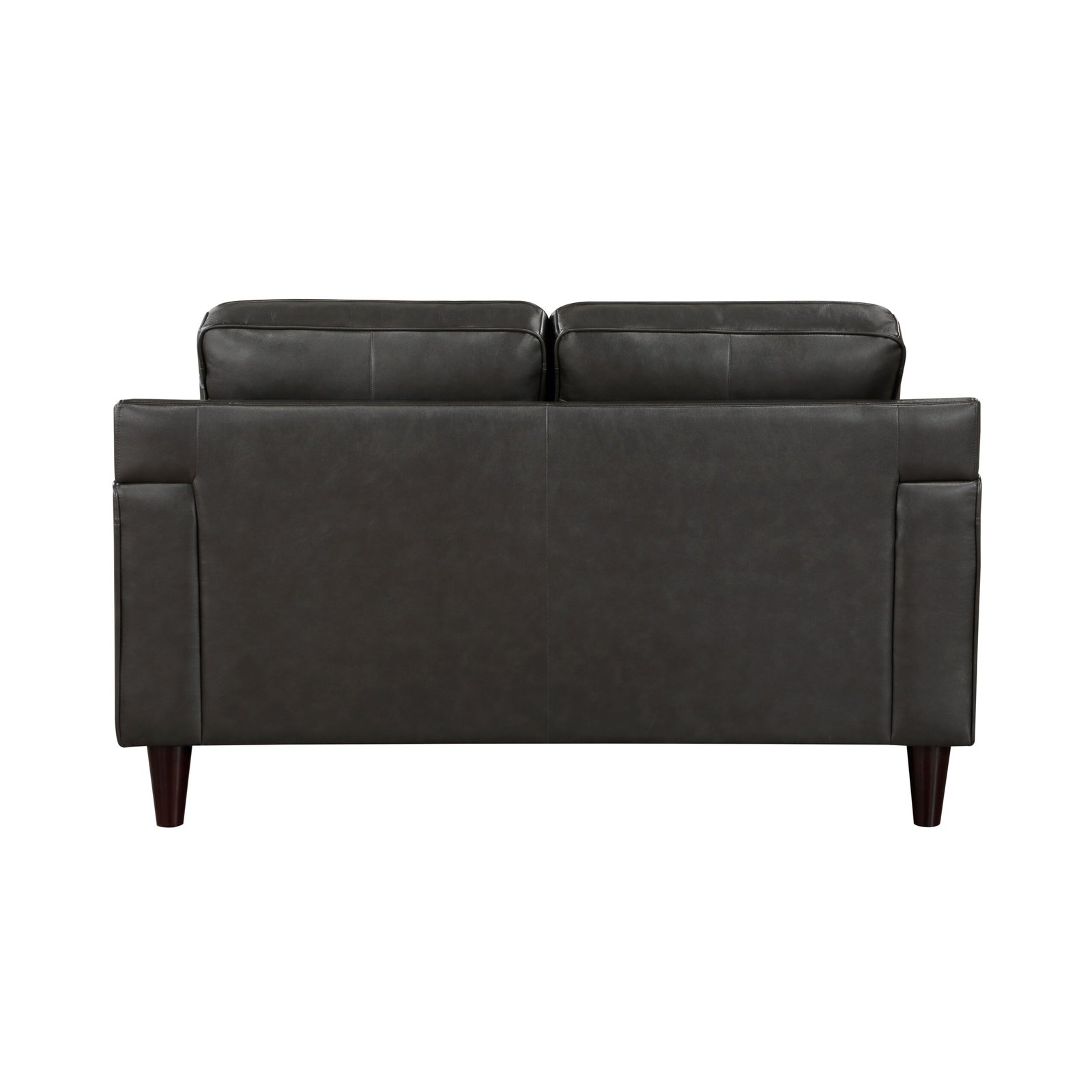 The tailored lines of the Aldrich Collection harken to the retro-inspired refinement of mid-century design, their understated elegance a perfect pairing for your living room. Gray genuine leather covers the frame of the love seat, where the body touches, with faux leather match everywhere else. The modern profile of the collection is supported by conical legs, while track arms define the timeless look.