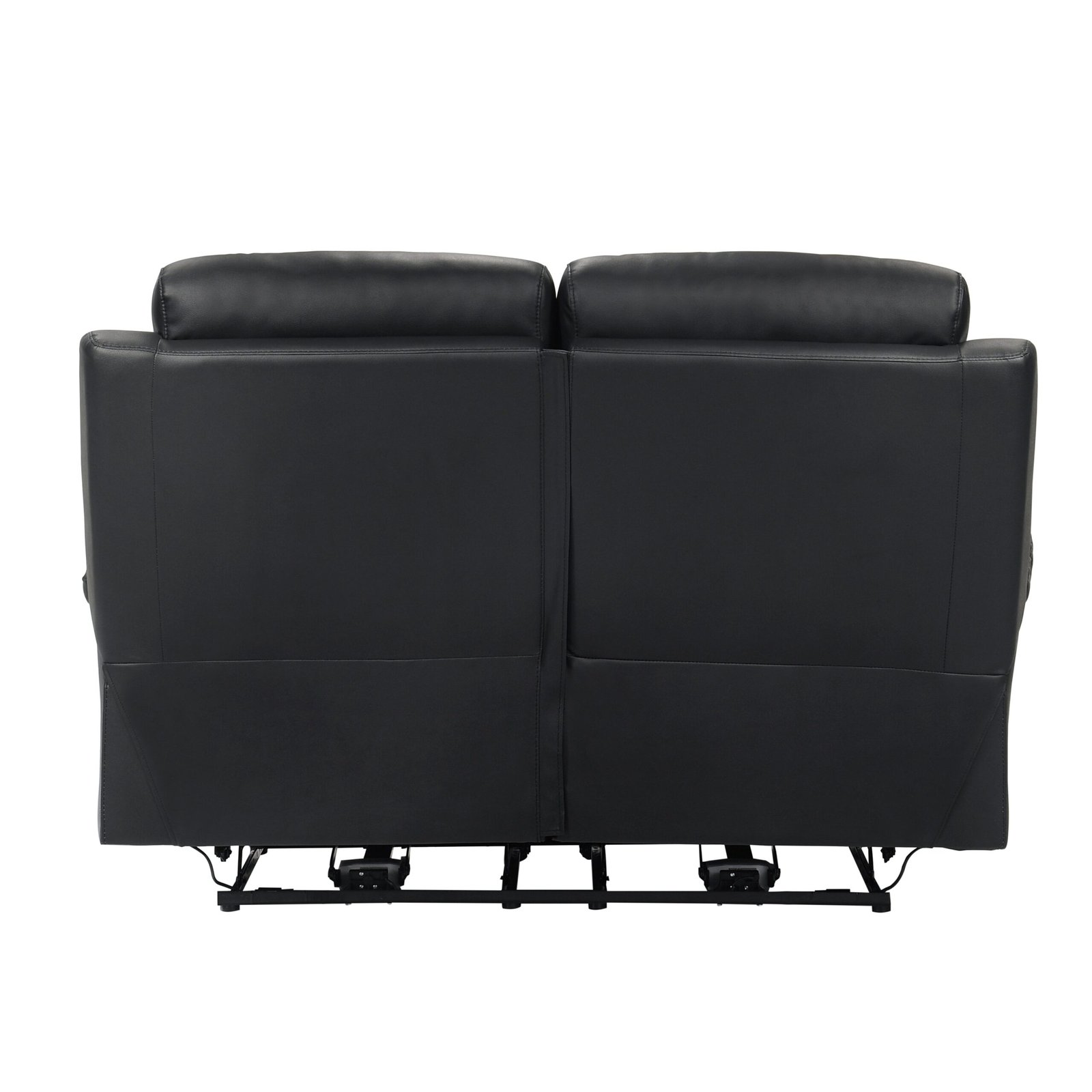 The Hancock Collection’s versatile look, paired with the feel of top grain leather and power reclining, will help to create a welcoming and comfortable space within your home. The dual reclining ends of the love seat are engaged with a touch to the side mounted power controls. The subtle modern frame of the love seat is covered in 100 percent top grain leather where the body touches, with faux leather covering the remaining areas, its black hue complementing your home’s décor.
