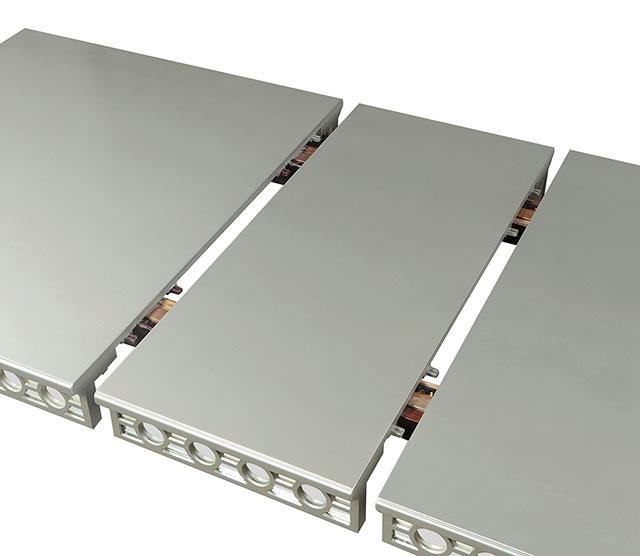 Dining in style is easy with this fabulous gray dining set. The table features intricate mirror designs on the apron and legs, brightening the room with soft, natural light reflections. Padded flannelette chairs add comfort to the chic design with their tufted wingbacks, nailhead trim, and soft gray tones. Glamorous and opulent, this ensemble provided comfortable seating with an expandable leaf that offers plenty of space for friends and family alike.