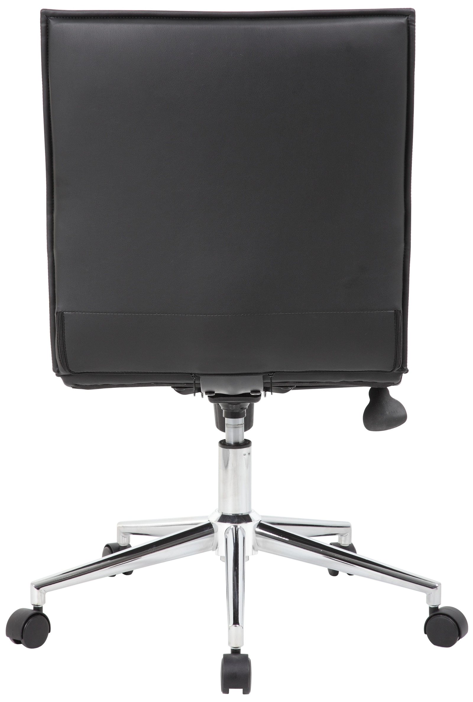 Introducing the Boss Black Vinyl Armless Hospitality Chair [B9534C-BK], designed to elevate any room or office with its sleek ribbed black vinyl design. Equipped with a sturdy chrome 25″ base and 2″ nylon dual wheel casters, this chair adds a touch of metallic flair to any space. Its impressive features include a spring tilt mechanism, pneumatic gas lift for effortless height adjustment, tilt tension, and an upright lock, with a maximum weight capacity of 275 lbs.