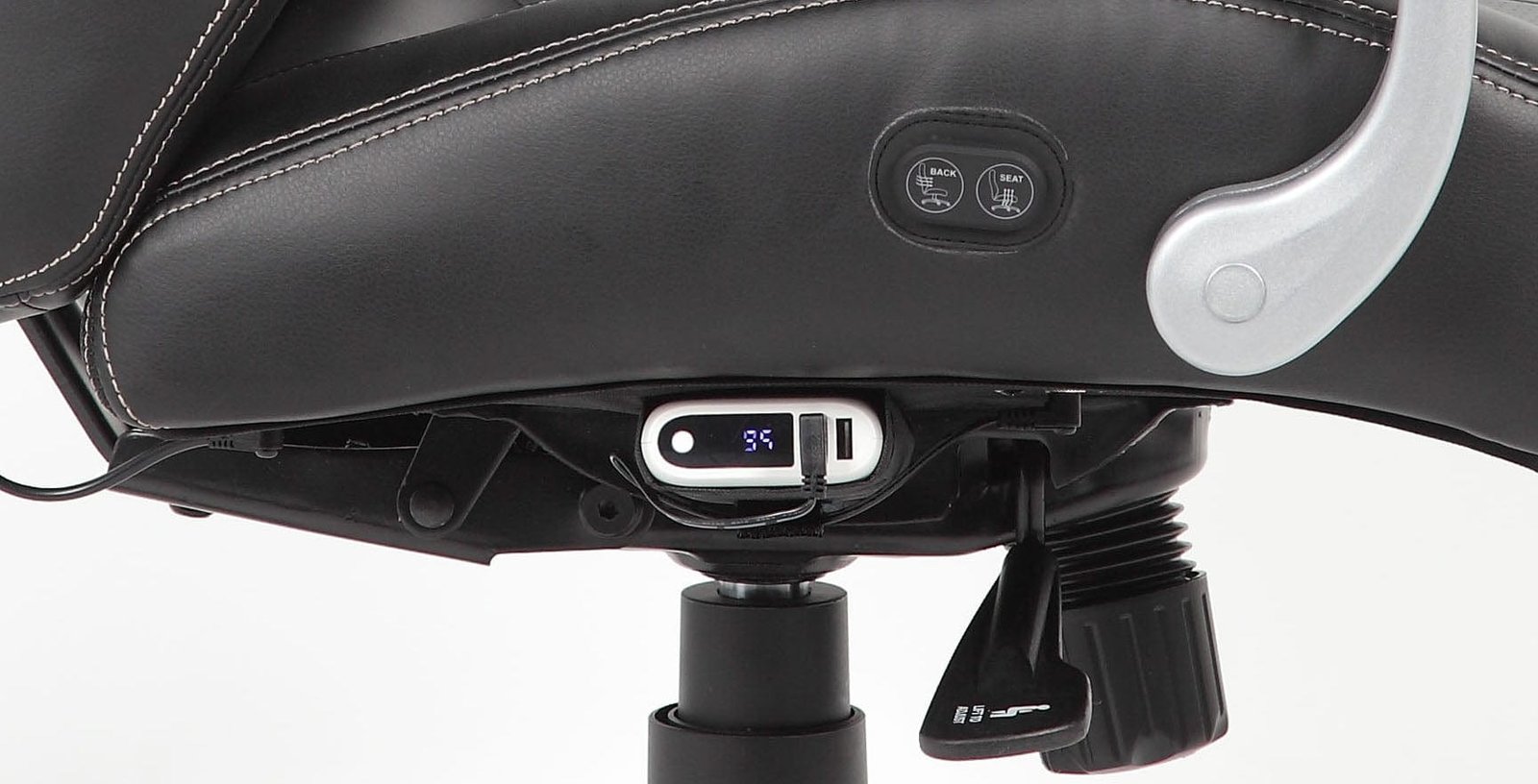 This executive office chair features sit-to-activate heated cushions. It has two heating pads – one in the seat and another in the lower lumbar area. Each heating pad has a separate control button and offers two temperature options, allowing you to control them independently. The control buttons are conveniently placed on the side of the seat and can be accessed easily, even while seated. A rechargeable lithium battery powers the chair. This chair is perfect for cold warehouses, factories, and offices. If you are one of those who bundle up indoors because you’re always cold – this is your chair!