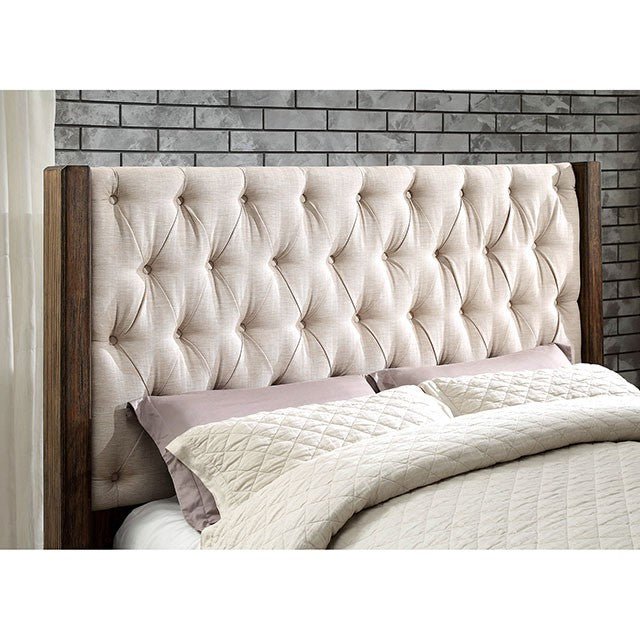 Set the scene for serene relaxation with this beautiful set and its gorgeous rustic natural tone finish. Diamond tufting can be found all along the fabric upholstered wingback style headboard while the wood grain emphasizes the natural finish. Footboard drawers provide ample storage. The simple design speaks volumes with its elegant centerpiece and supporting case goods.