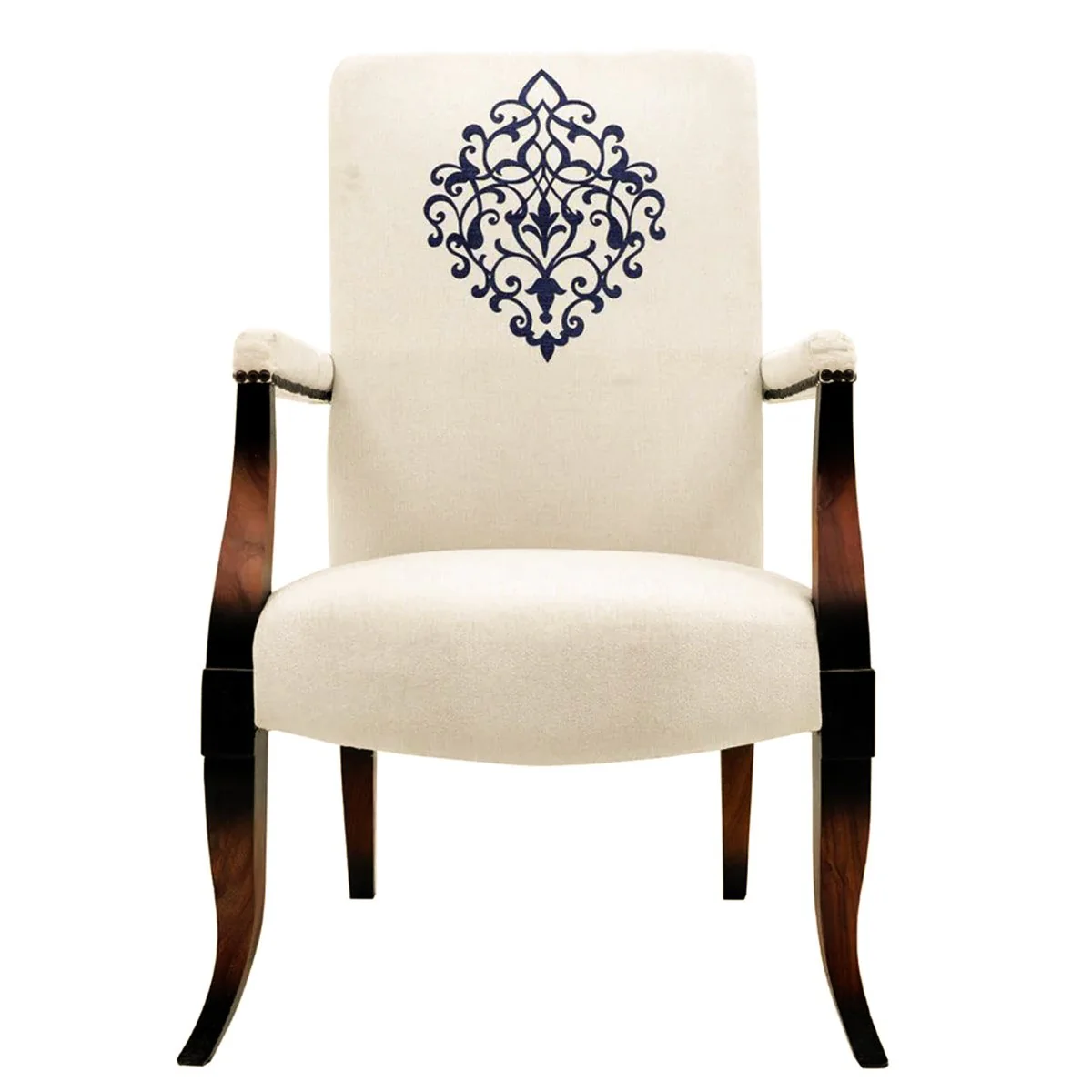 Elevate your space with the Vale Chair, designed for both style and comfort. Its ergonomic design features the perfect height and a curved seat that supports the back, ideal for easy conversations. The solid Sheesham wood base provides stability, while the suede fabric upholstery offers a luxurious feel. Finished with an antique polish, this chair exudes both grandeur and confidence.