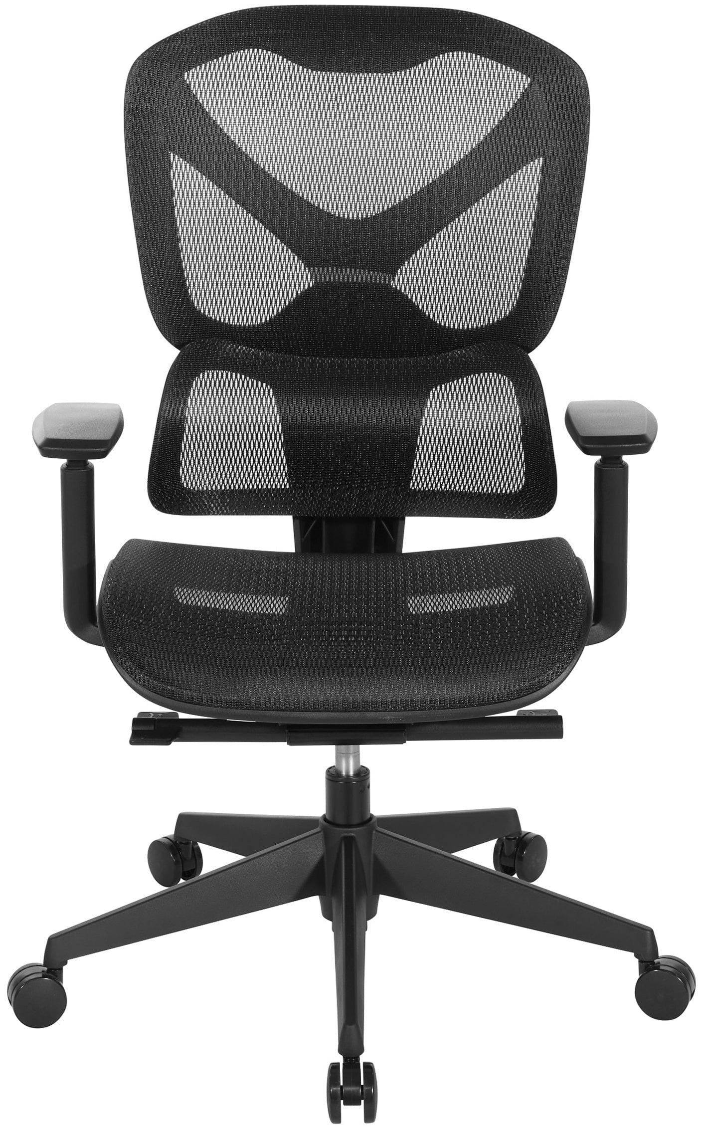 - Breathable black mesh seat and back with self-adjusting lumbar support