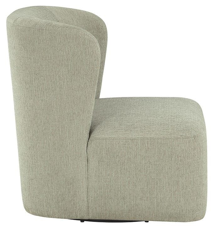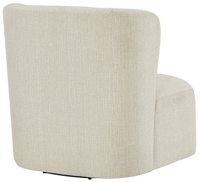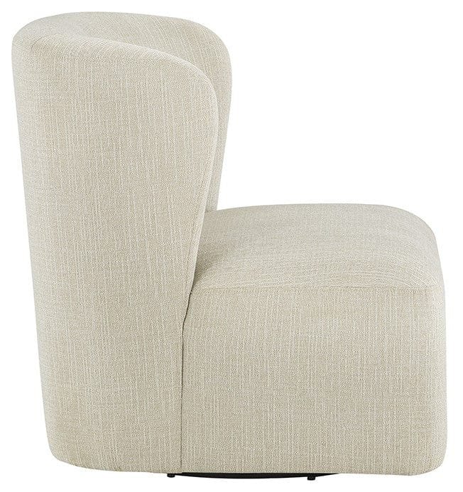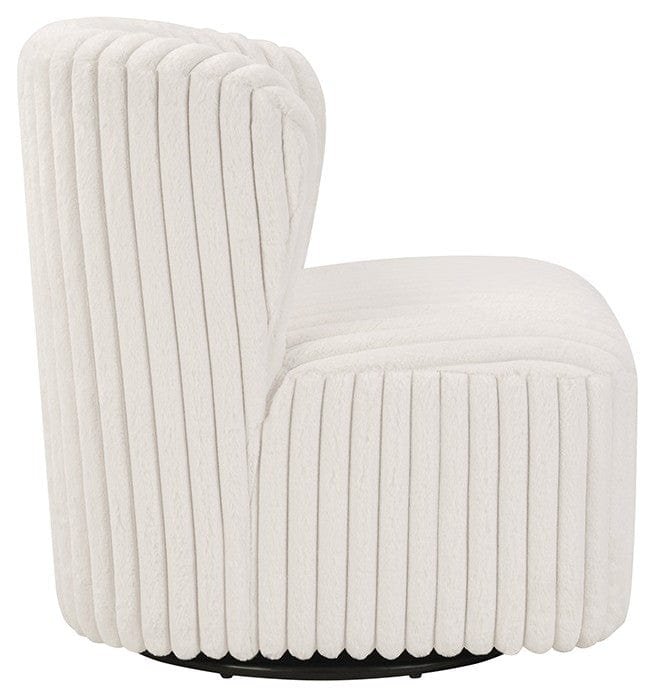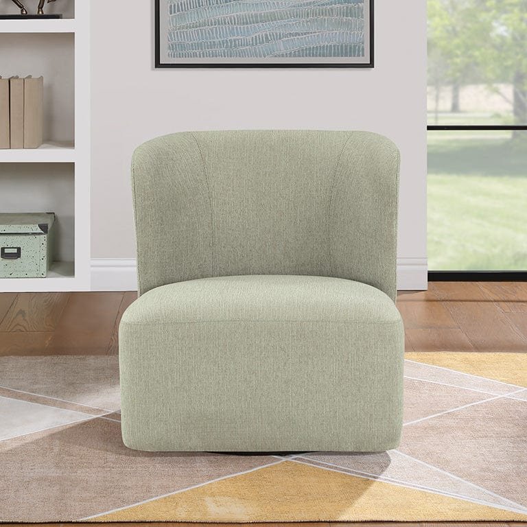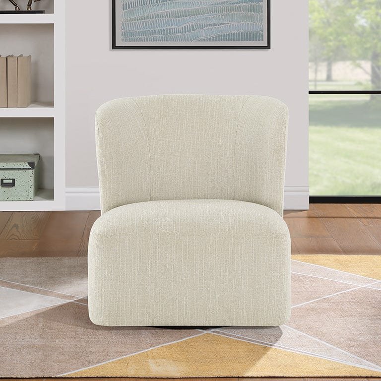An impressive statement from every angle, the ultra-modern Ave Six Upholstered Swivel Accent Chair embraces ultra-modern sophistication and chic confidence with a modified barrel design. The 360-degree panoramic swivel allows long hours of comfort for relaxed conversation and cozy television watching. Its minimal footprint design is ideal for small-space living. This chair is perfect to accent a home office or guest room. Two chairs around a small square or round accent table could complete a room or be the focal point. The coil spring cushion and sinuous spring support provide comfort and long-lasting durability. With a choice of linen fabric, fog fabric, or white corduroy, you can effortlessly elevate any décor. Arriving fully assembled, this chair is ready to add a touch of class to your space.