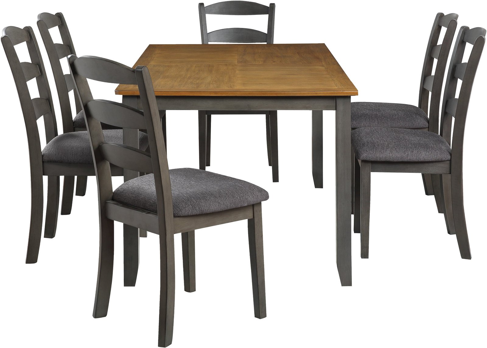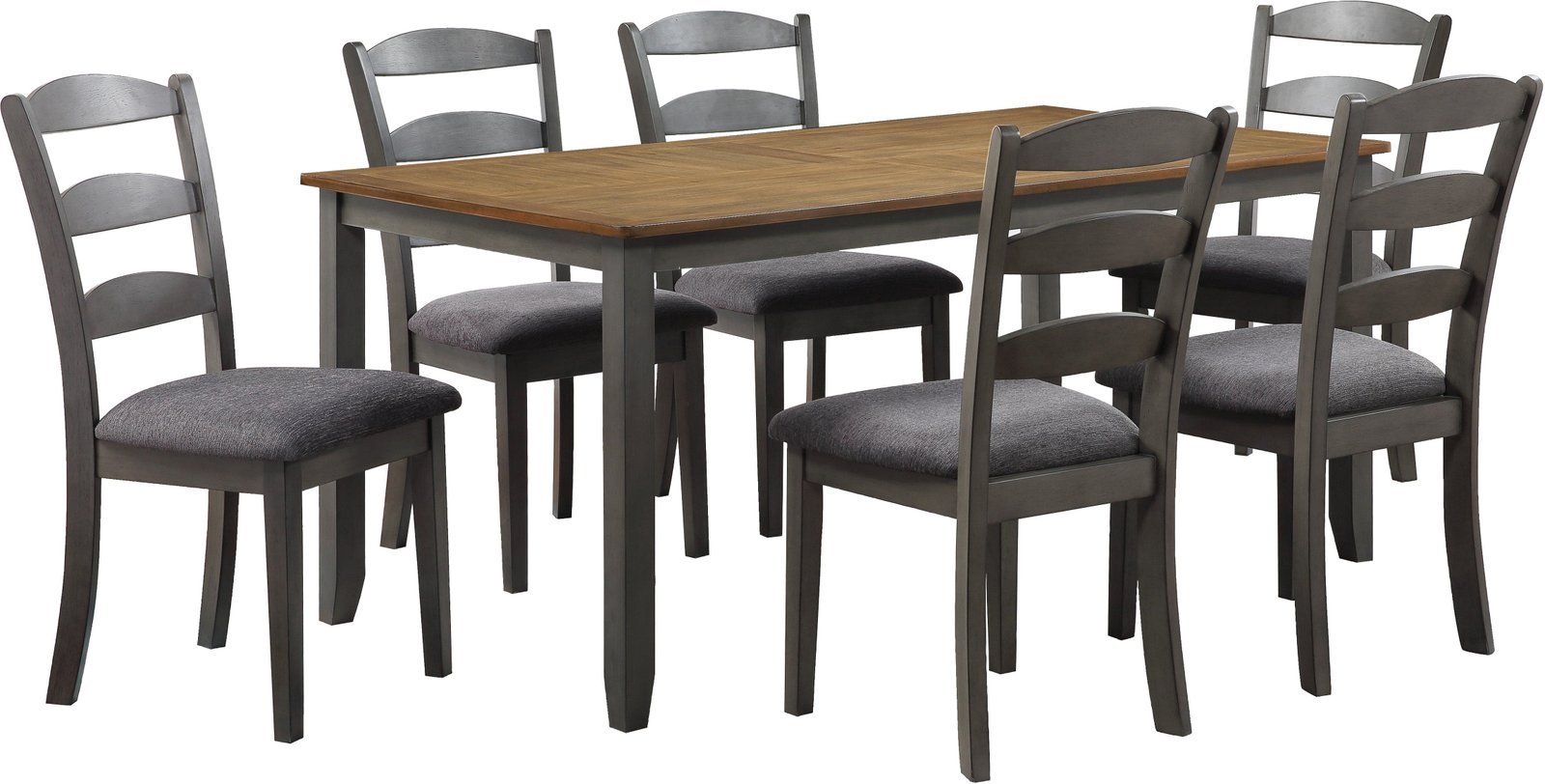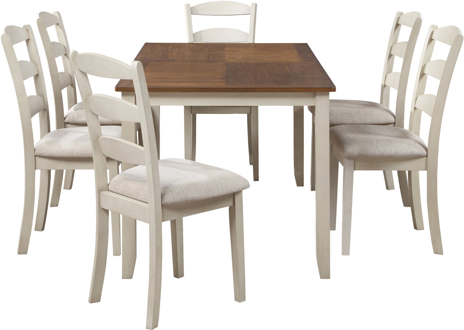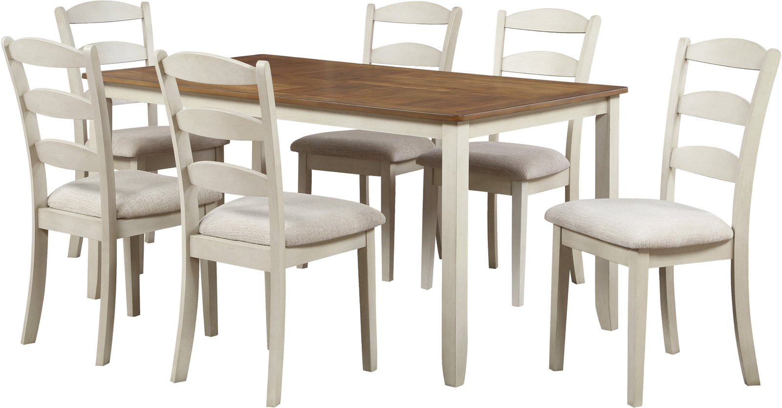 Introducing our traditional 7-piece dining set, the perfect gathering spot for your family and friends. The attractive two-tone style features a beautiful natural woodgrain veneer top and a lightly distressed solid wood painted frame that creates a classic farmhouse feel. The set is crafted with durable rubberwood solid block and brace construction to ensure leisurely dining and conversations for years to come. The chairs are designed with high, comfortable backs, padded 100% Polyester upholstered seats, and tapered legs. The set includes a table and 6 matching chairs.