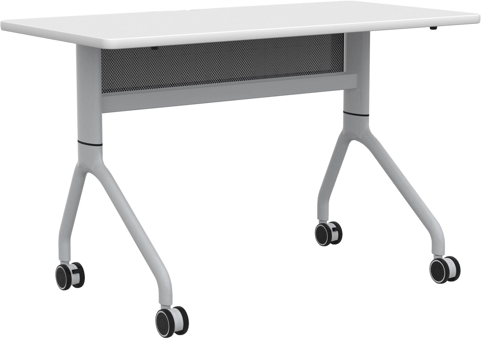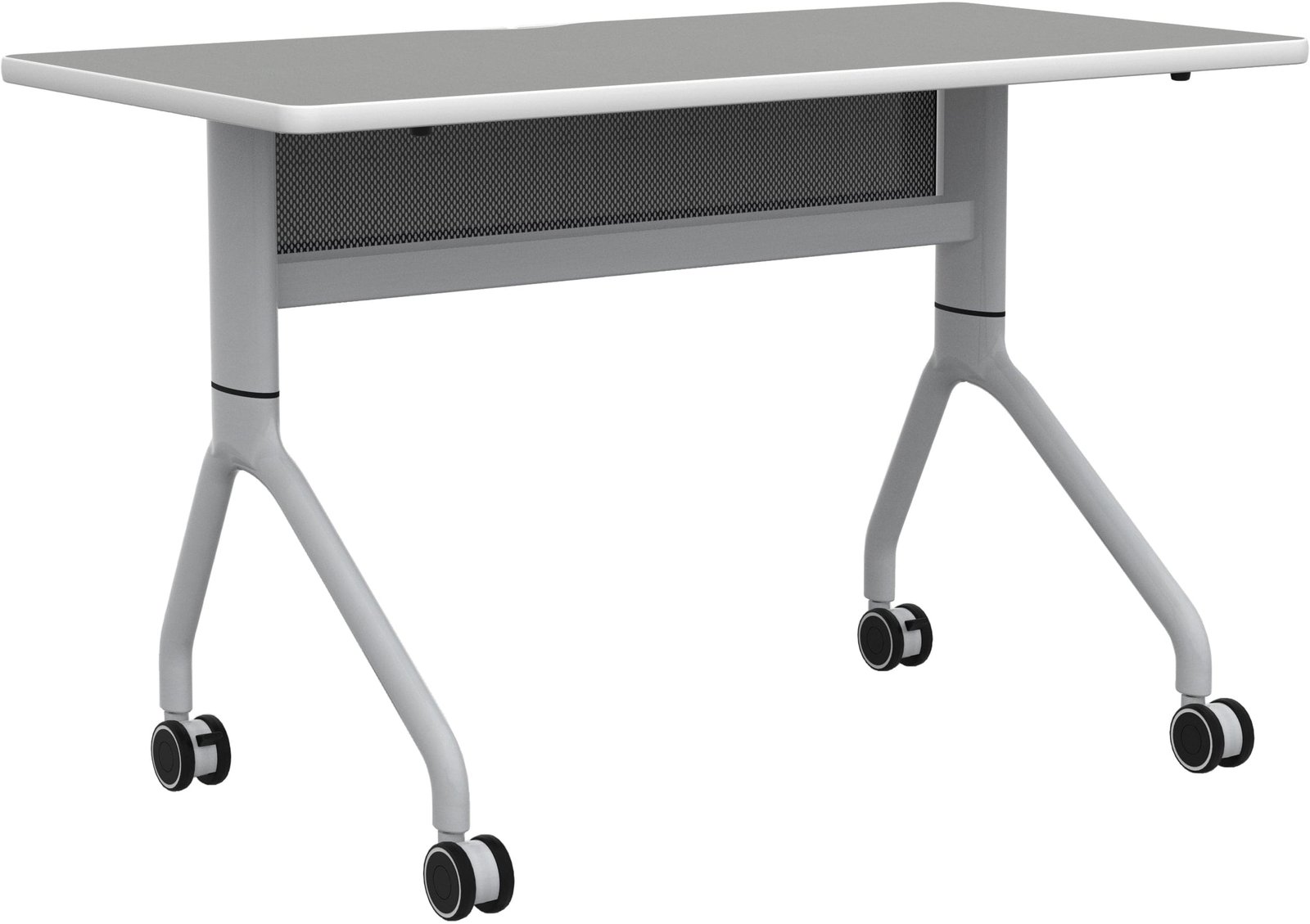 Rumba Flip Tables offer a range of features that make them suitable for various workspaces. They are versatile and durable, with high-pressure laminate tops, dual wheel casters, and folding and nesting capabilities. You can extend a bank of tables using the ganging capabilities and configure them into different styles based on your needs. When not in use, the tops fold down, allowing for easy nesting and compact storage. The tables come with integrated cable management and mesh modesty panel. They are ideal for training rooms, education environments, collaboration areas, open floor office plans, and conference rooms. Choose from three laminate options, all with a silver metal base.