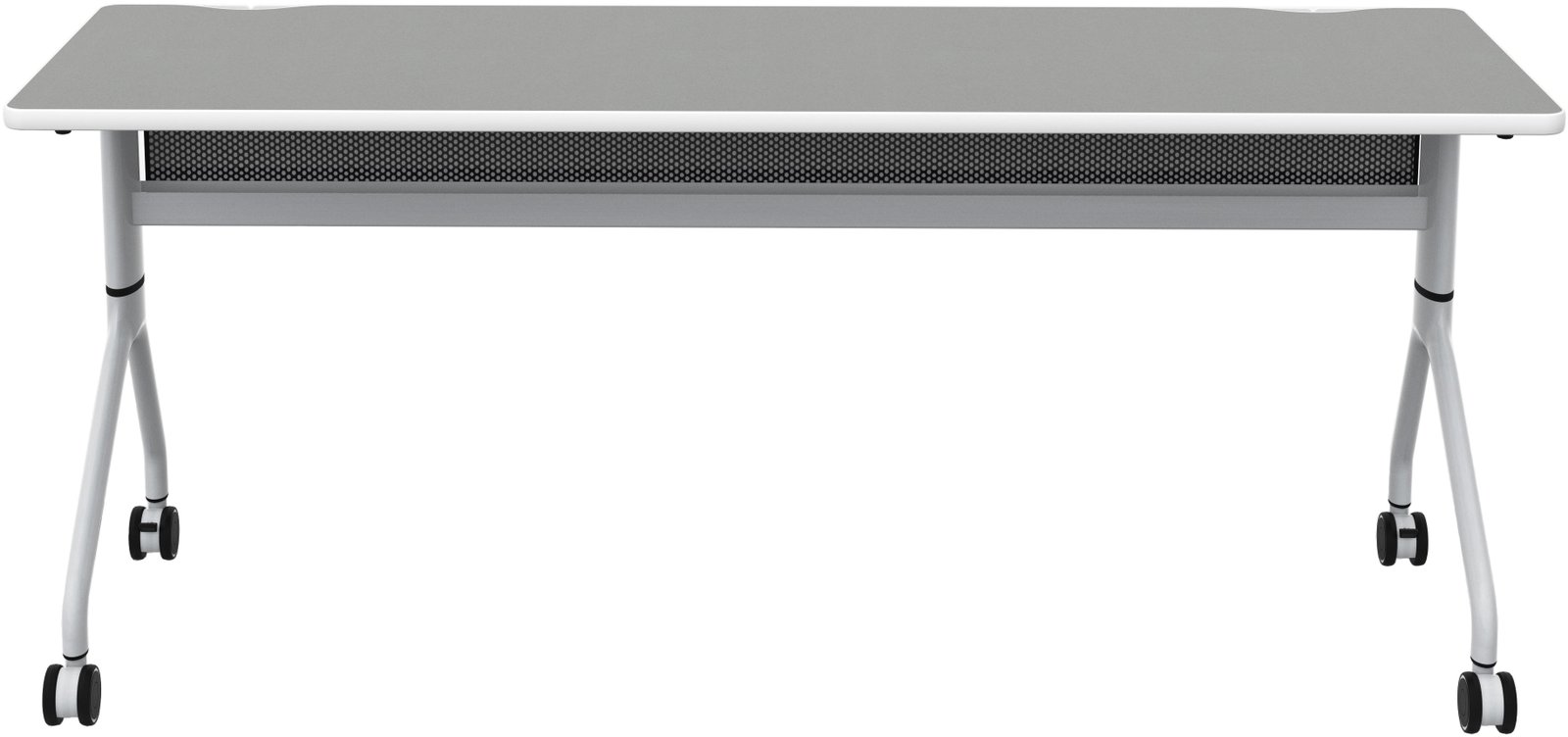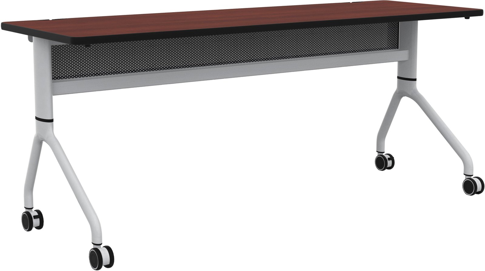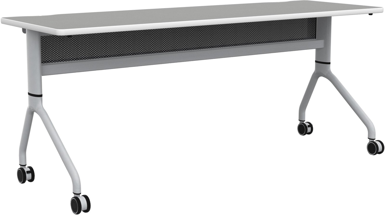 Rumba Flip Tables are an extremely versatile and durable solution for any workspace. They come equipped with high-pressure laminate tops, dual wheel casters, and folding and nesting capabilities, making them perfect for training rooms, education environments, collaboration areas, open floor office plans, and conference rooms. The ganging capabilities allow you to extend a bank of tables and configure them into multiple styles to meet your needs. The tops fold down for easy nesting and compact storage when not in use. The tables also feature integrated cable management and mesh modesty panels. You can choose from three laminate options; all have a silver metal base.