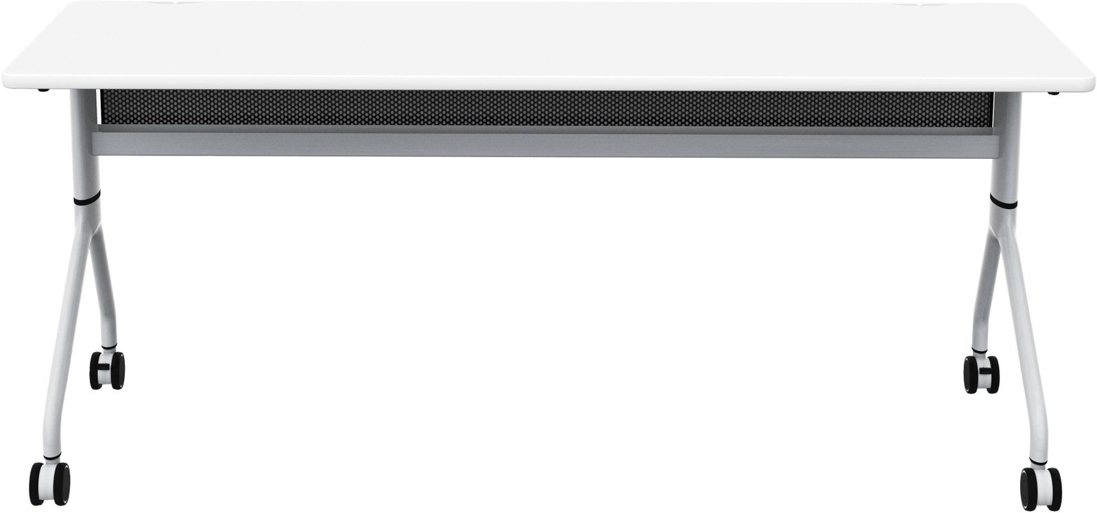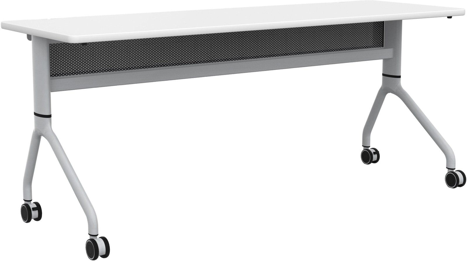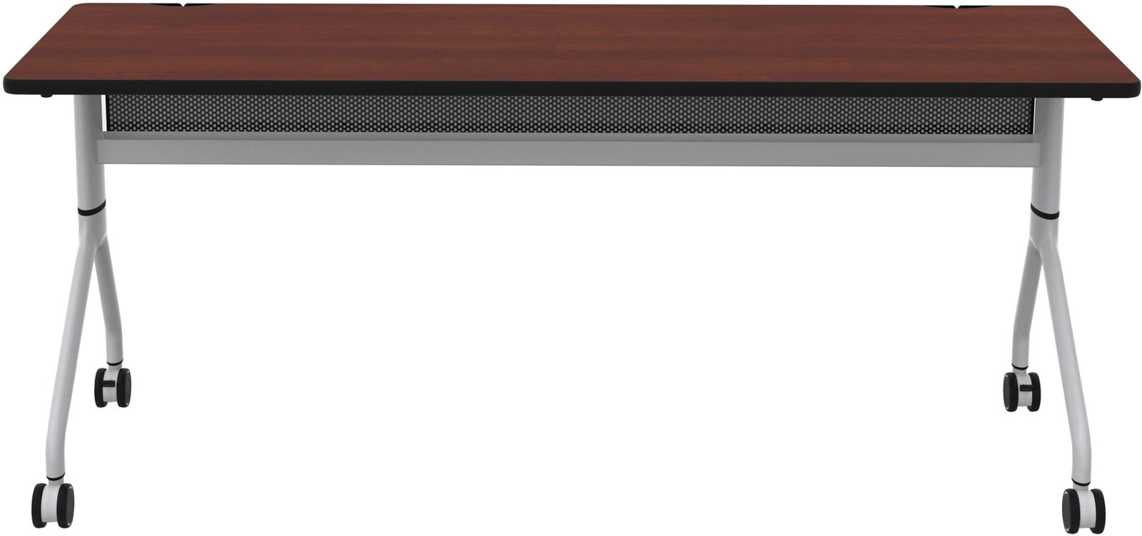 Rumba Flip Tables are an extremely versatile and durable solution for any workspace. They come equipped with high-pressure laminate tops, dual wheel casters, and folding and nesting capabilities, making them perfect for training rooms, education environments, collaboration areas, open floor office plans, and conference rooms. The ganging capabilities allow you to extend a bank of tables and configure them into multiple styles to meet your needs. The tops fold down for easy nesting and compact storage when not in use. The tables also feature integrated cable management and mesh modesty panels. You can choose from three laminate options; all have a silver metal base.