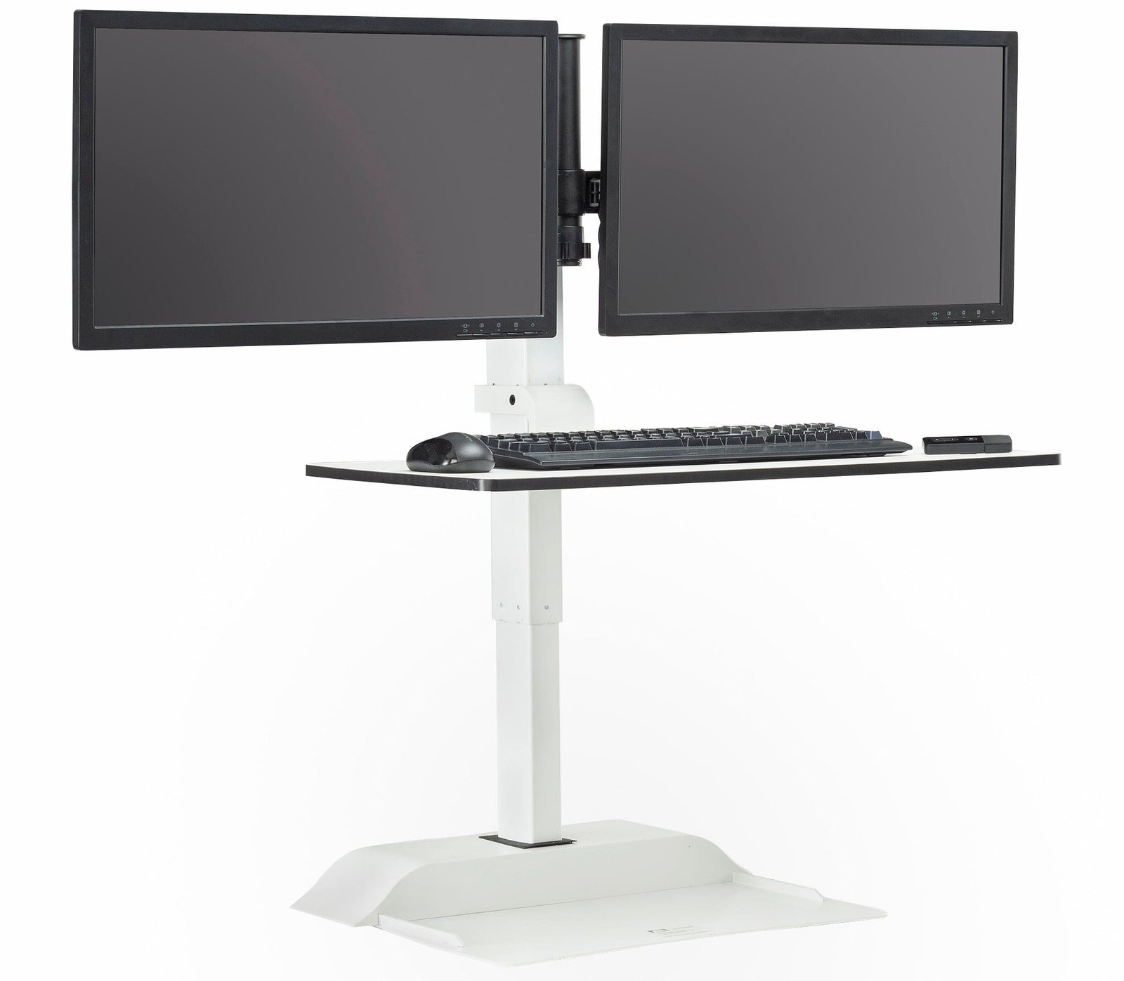 - Versatile remote control surface that rises to allow the user to adjust to sit or stand while working and includes two monitor arms