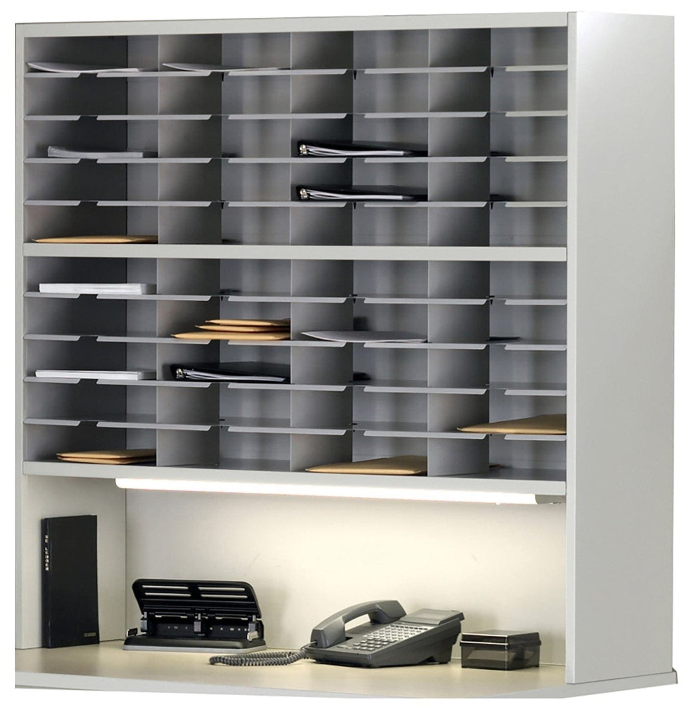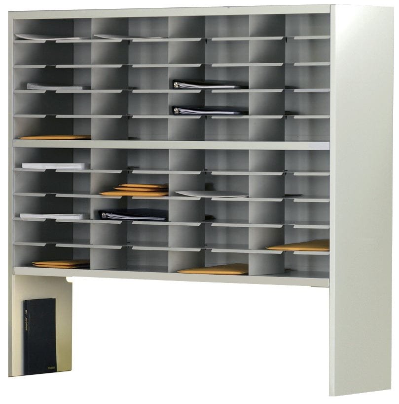 The 2-tier sorter with riser from Safco Products features 40 pockets (11 5/8″W x 2 5/8″H x 13 1/4″D). The shelves are fixed, and the pockets are sized to accommodate commonly used 10″ x 13″ flat envelopes. Optional side dump rails, a task light, and label holders are also available. The sorter has a durable steel construction and is ready to assemble.
