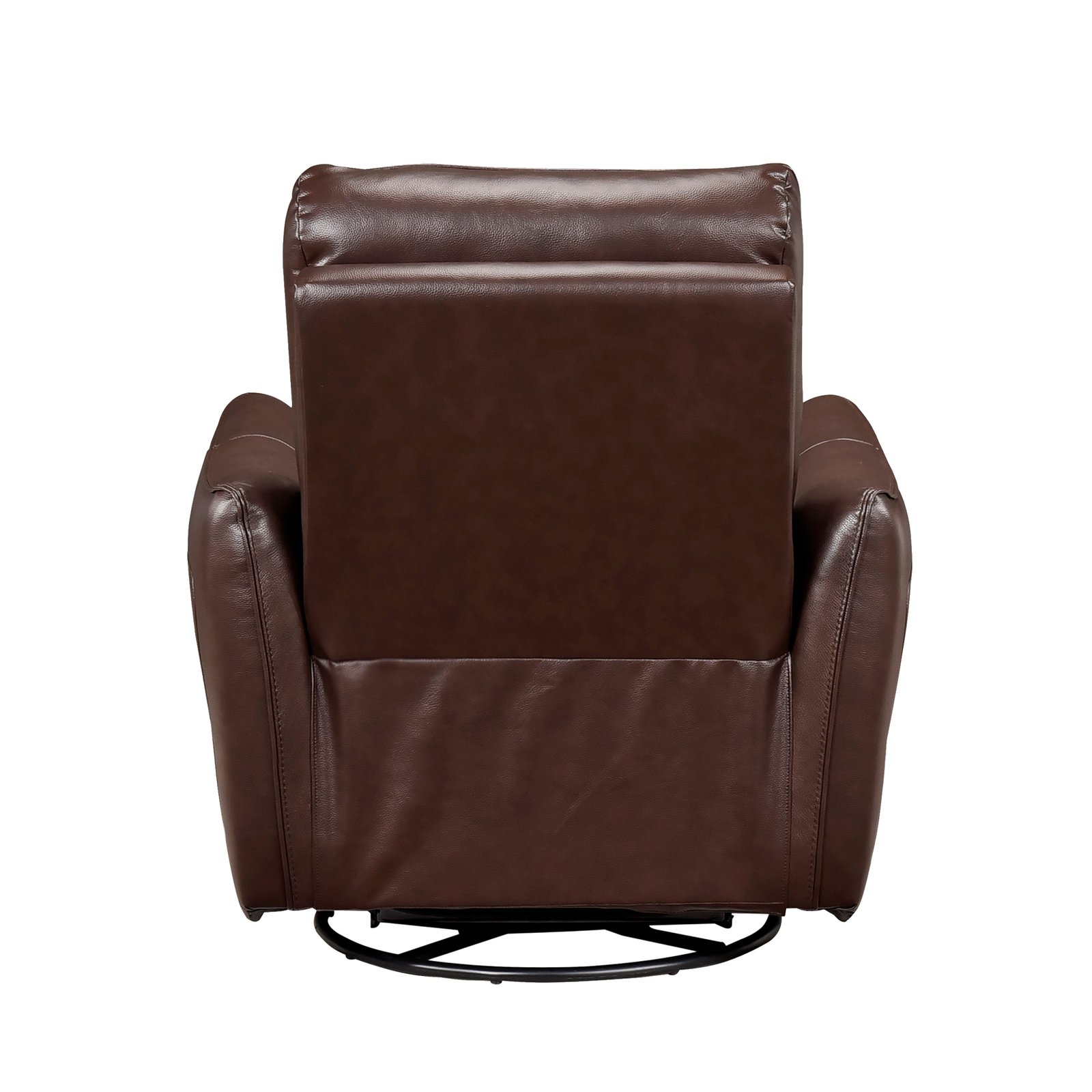 Indulge in ultimate relaxation with this luxurious top grain leather swivel glider recliner. Designed for both comfort and style, this recliner features a robust solid wood and plywood frame with a metal reinforced seat, ensuring durability and stability. The high-density foam padding over pocket coils provides exceptional support, while the top grain leather where the body touches offers a premium feel. Enjoy effortless reclining with the easy-to-use pull-handle mechanism, along with a smooth 360-degree swivel and gentle gliding motion for complete relaxation. The attached back and seat cushions maintain a sleek profile, and with a 300lbs weight capacity, this recliner is built for lasting comfort.