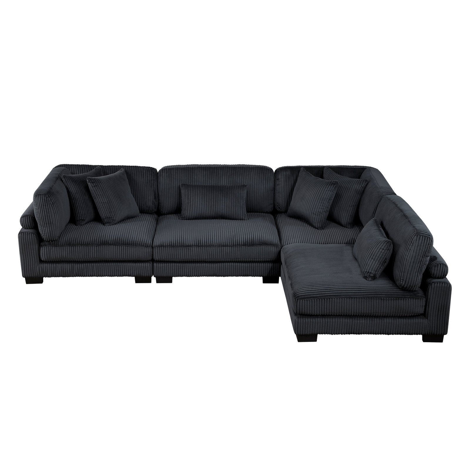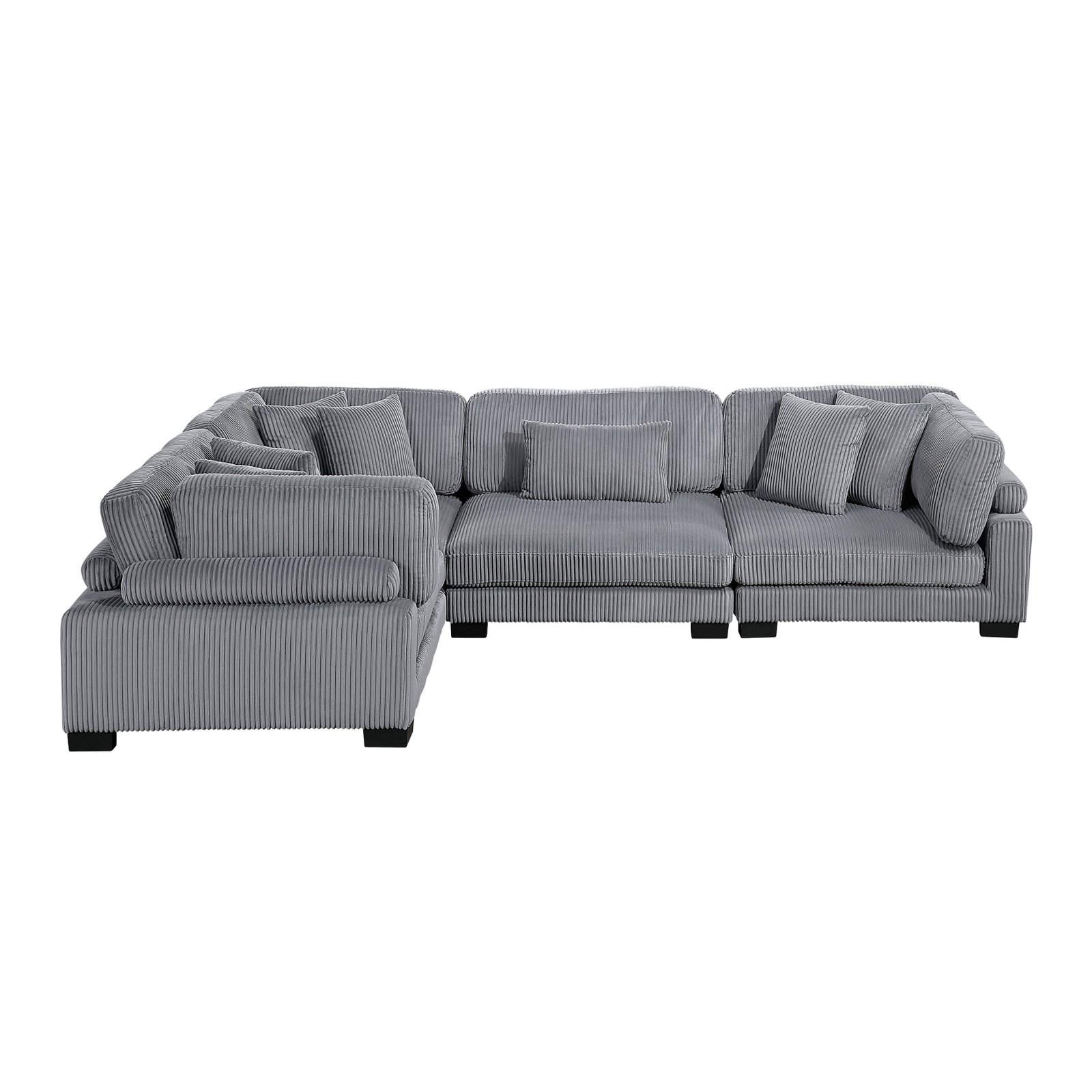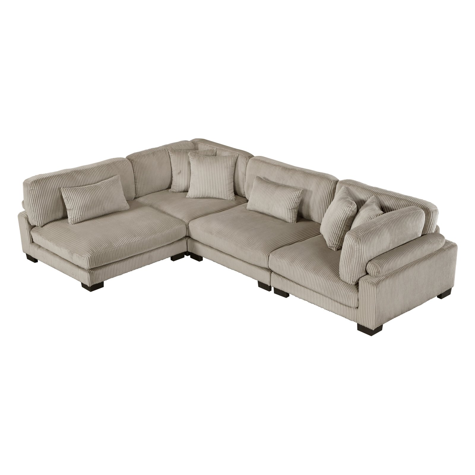 Configurable to your available space, the Traverse Collection allows for the addition and detachment of pieces for a customized seating experience. The 4-piece sectional configuration consists of three corner units paired with one armless chair. The beige corduroy fabric upholstery creates a plush expanse for a soft touch experience.
