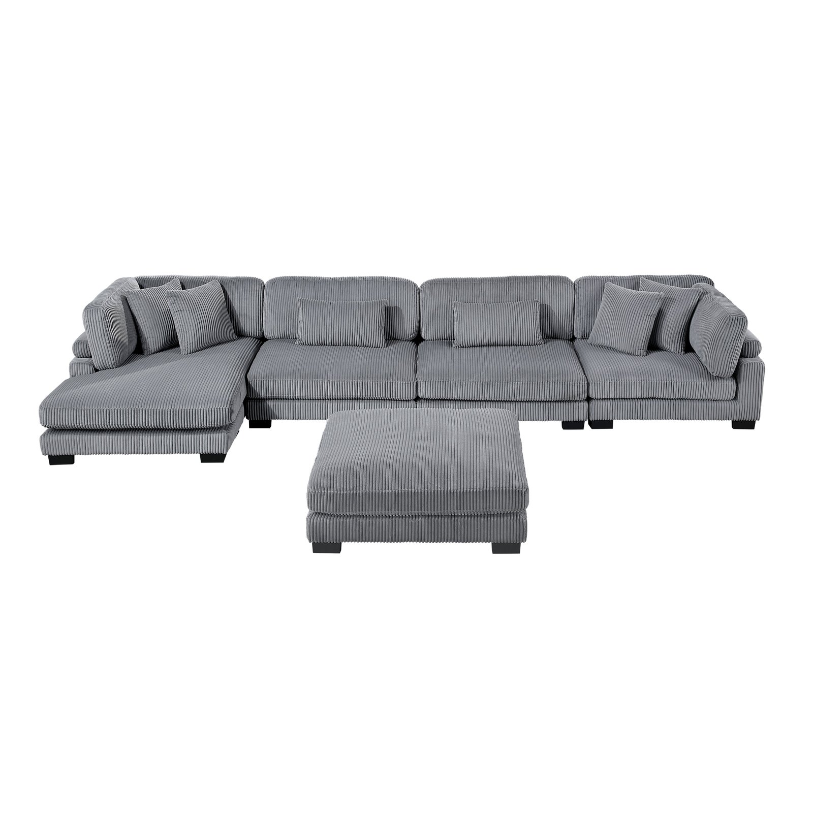 Configurable to your available space, the Traverse Collection allows for the addition and detachment of pieces for a customized seating experience. The 5-piece sectional configuration consists of one corner unit paired with two armless chairs, a chaise, and an ottoman . The beige corduroy fabric upholstery creates a plush expanse for a soft touch experience.