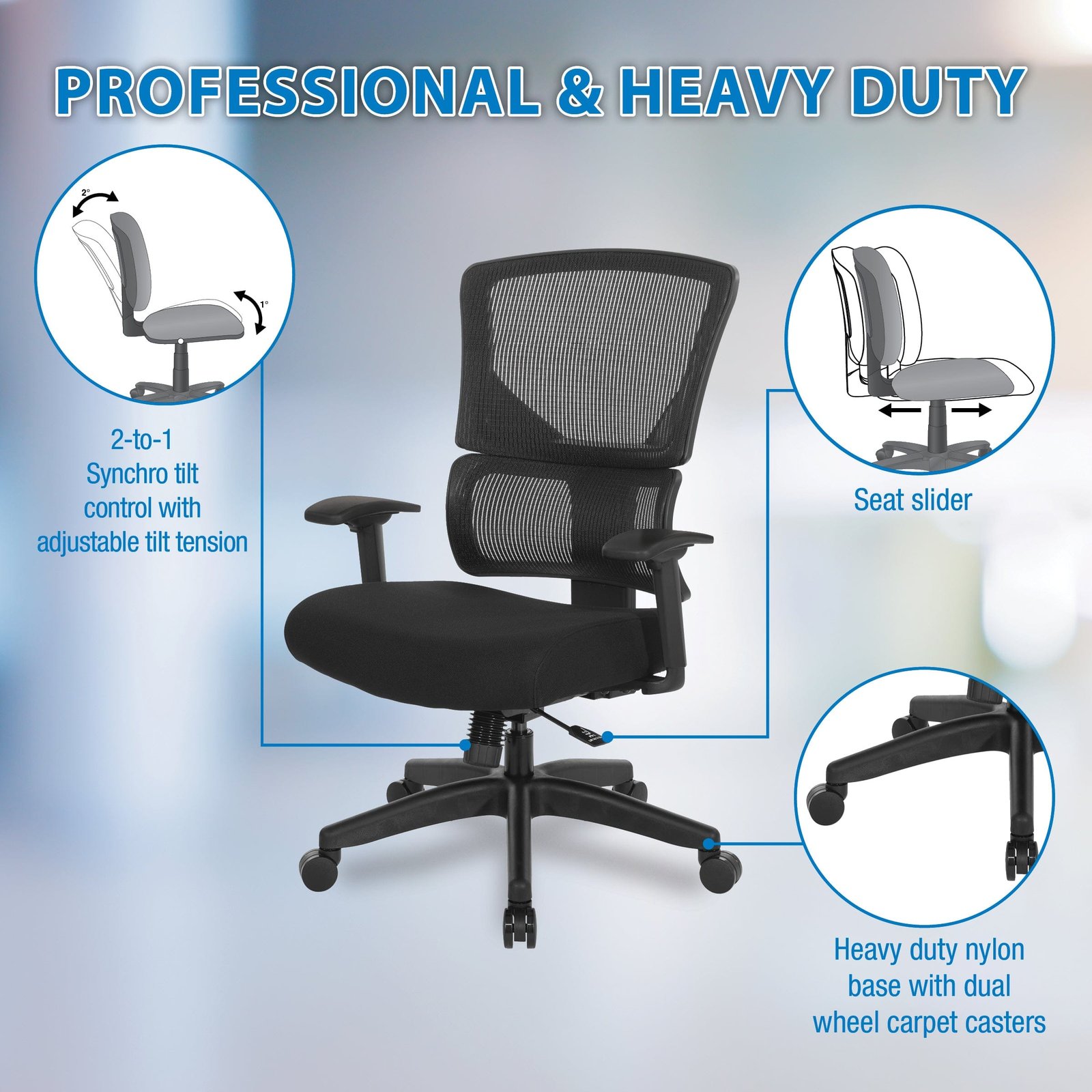 - Heavy duty black nylon base with oversized dual wheel carpet casters