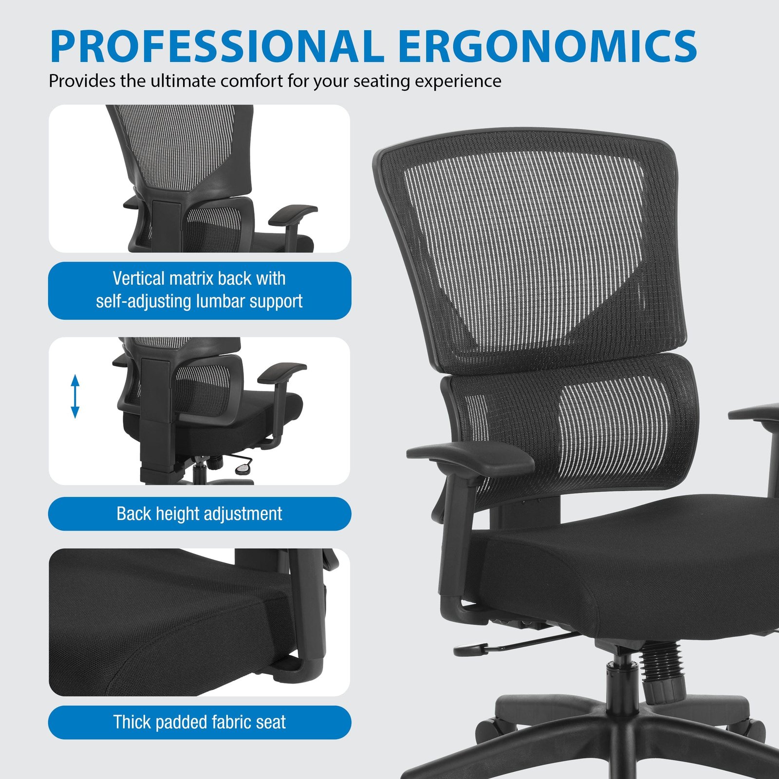 - Breathable Vertical Matrix back with self-adjusting lumbar support